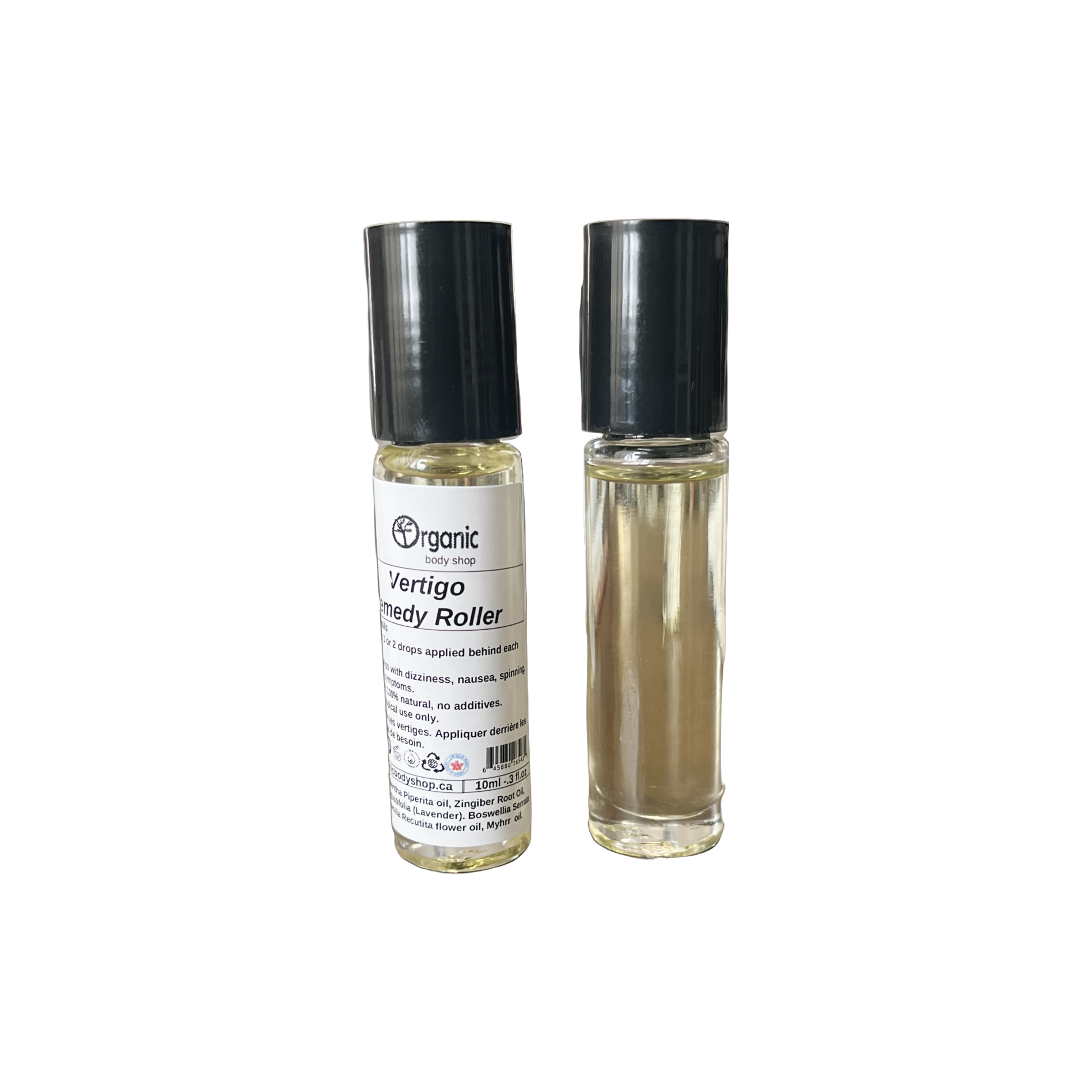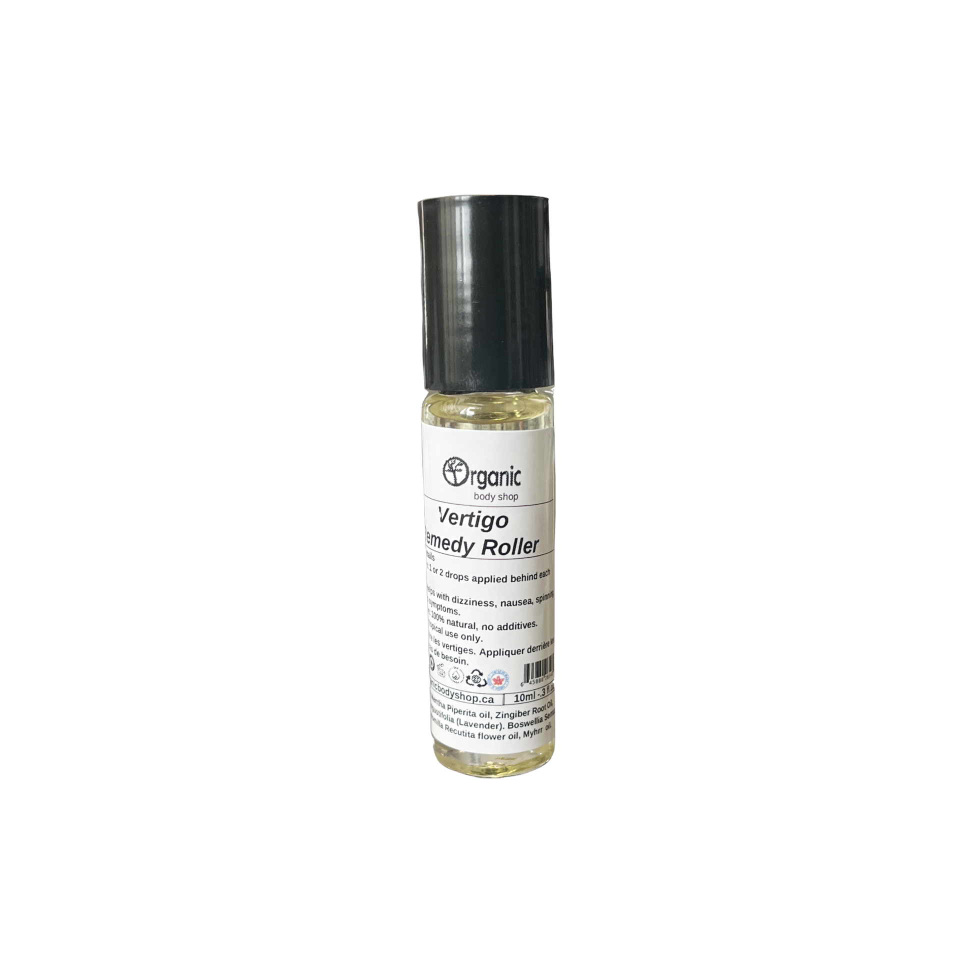 French; Roll-on contre les vertiges. Appliquer derrière les oreilles en cas de besoin.